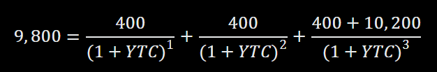 계산값(9,800.54)이 시장가격(9,800원)에 매우 근접하므로, YTC ≈ 4.9%로 추정